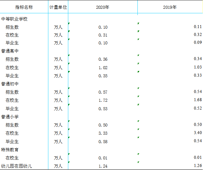 全縣共有普通高中教育學(xué)校4所,中等職業(yè)學(xué)校2所,普通初中15所,普通小學(xué)76所,幼兒園67所,特殊教育學(xué)校1所。高中階段教育毛入學(xué)率95.3%,初中入學(xué)率為99.97%,小學(xué)學(xué)齡兒童凈入學(xué)率為100%,學(xué)前教育三年毛入園率85.1%(見表4)。